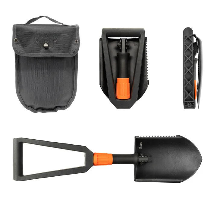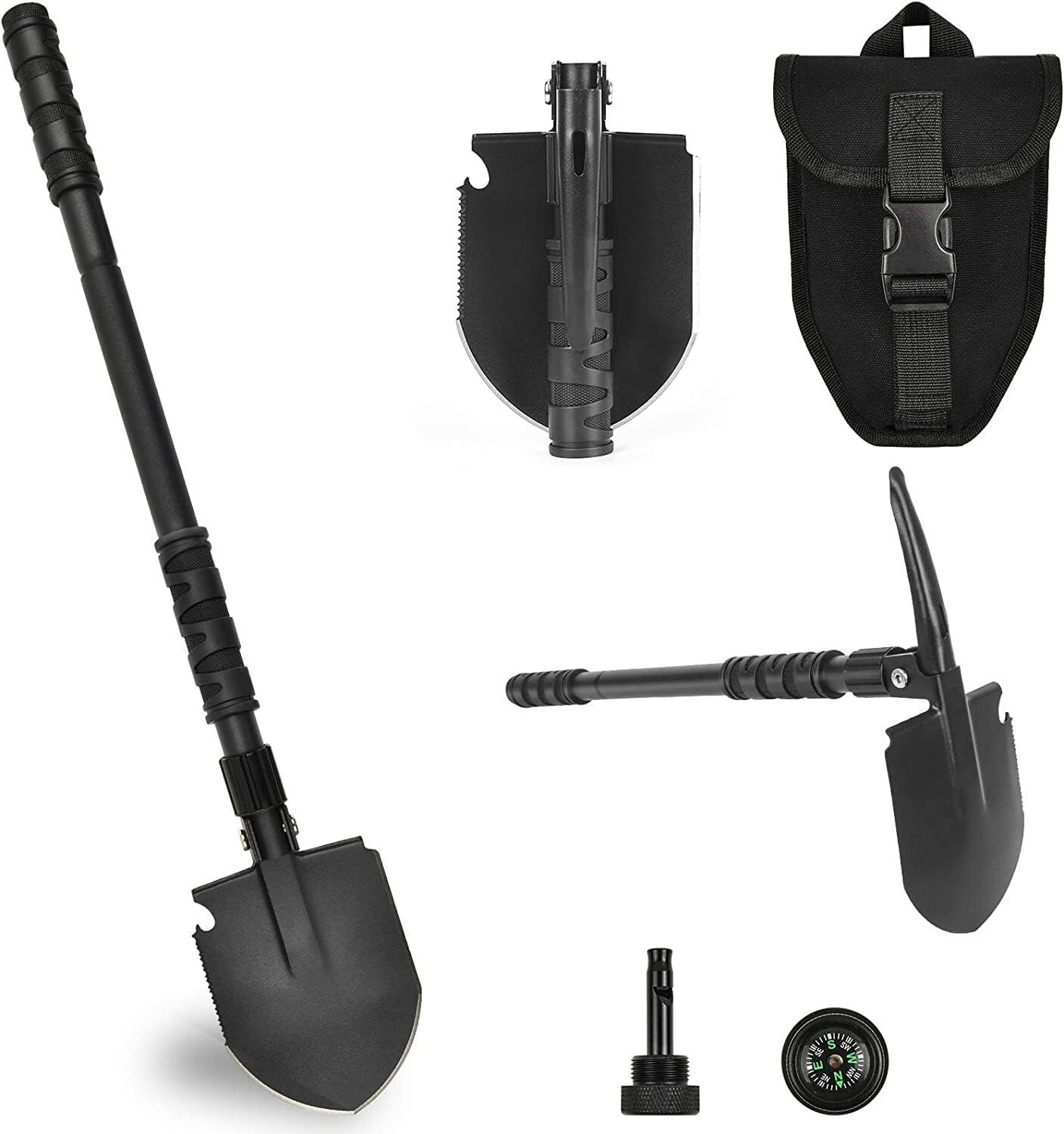 Crafted from durable carbon steel, this lightweight, foldable shovel easily tackles digging, trenching, and cutting. Its serrated edge slices through rugged terrain, while the compact design fits in your pack or car. It features a shovel for digging, a pickaxe for gardening, a saw for cutting, a whistle for help, a compass for navigation, and a bottle opener for drinks. Perfect for camping, survival, or emergency situations.