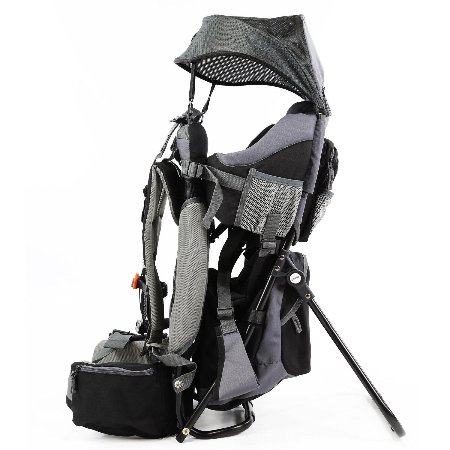 Explore the outdoors with your little one in the Little Backpacker! This lightweight (6.5 lbs) hiking carrier, crafted from a sturdy aluminum frame and cloth, is perfect for kids 9-48 months. Featuring adjustable straps, padded shoulder pads, a waist belt, multiple pockets, an insulated bottle compartment, and a diaper pad, it ensures comfort and convenience. The removable sun/rain canopy and foldable stand make it ideal for camping or hiking.