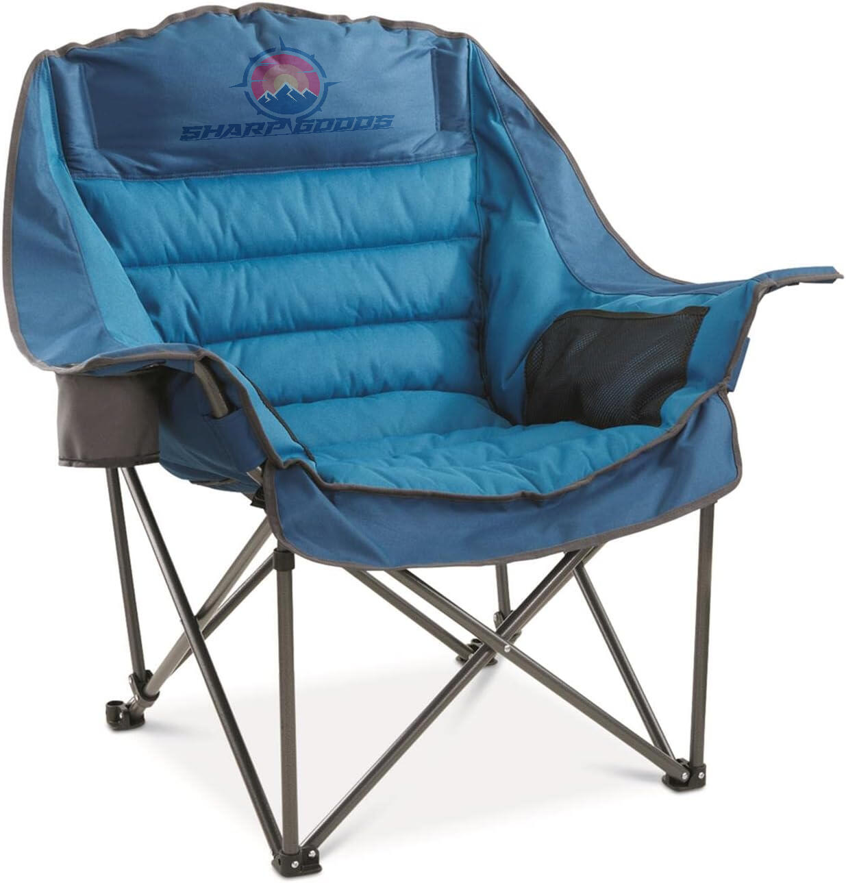 The Sharp Goods™ Padded Camping Chair is a highly functional and comfortable seating option for outdoor activities like camping, hiking, beach trips, or backyard lounging. Features high-loft padding in the seat, backrest, and headrest, providing excellent lumbar and neck support for extended relaxation. Built with a sturdy powder-coated steel frame that accommodates users of various sizes. Folds easily for storage and transport, and comes with a deluxe expandable compression carry bag featuring backpack-style straps for convenient carrying. Features an oversized cup holder for beverages or a 30 oz. tumbler, along with mesh pockets on the inner arms for storing essentials like tomephones, keys, or books. This chair is ideal for those seeking a durable, comfortable, and portable seating solution for outdoor adventures, ensuring relaxation and convenience in various settings.