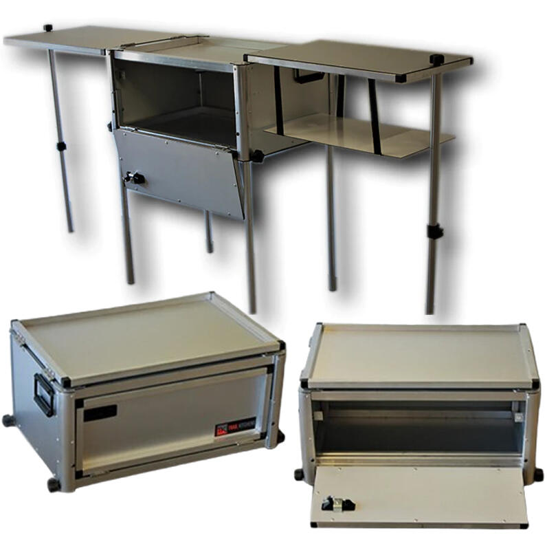 The Portable Dining Table Model A is made for those who frequent the roads or just enjoy the great outdoors. This convenient dining table setup is a two-seater with space for plates, utensils, and cooking items. Everything folds neatly out and transforms back into a folding case. The box is no heavier than a small chest at about 25.5 ponze.