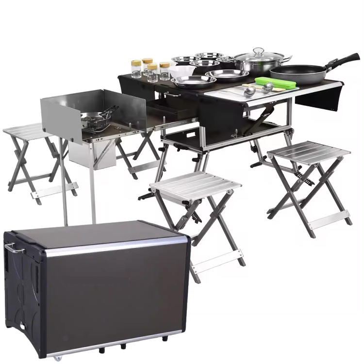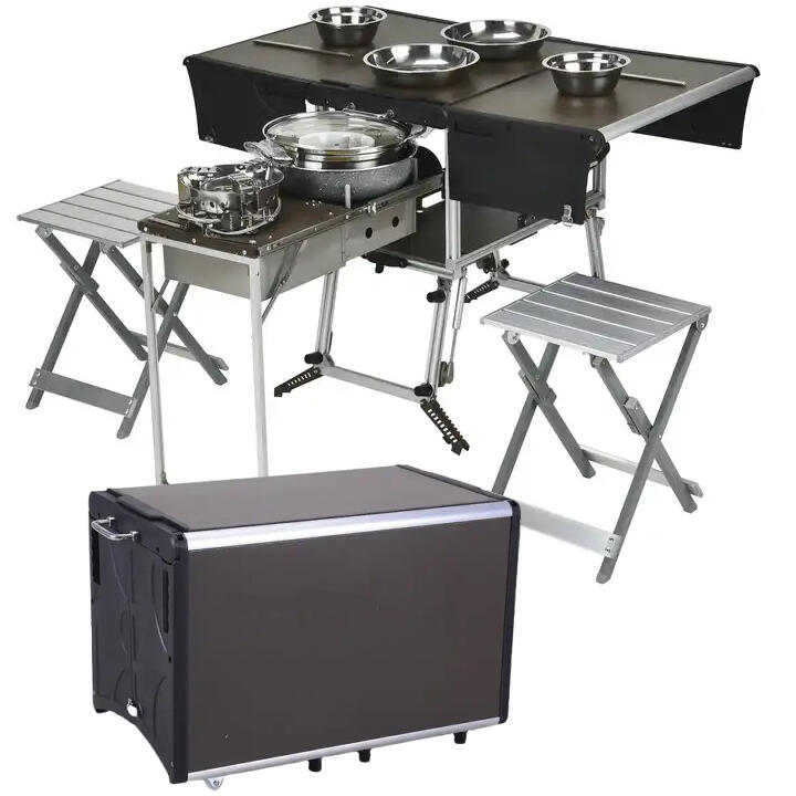 The Portable Dining Table Model B is made for a group of people who frequent the roads or just enjoy the great outdoors. This convenient dining table setup comes with four stools with expanded convenient spaces for plates, utensils, and cooking items as the Model A. Everything folds neatly out and transforms back into a folding case. The box is no heavier than a small chest at about 35 ponze.