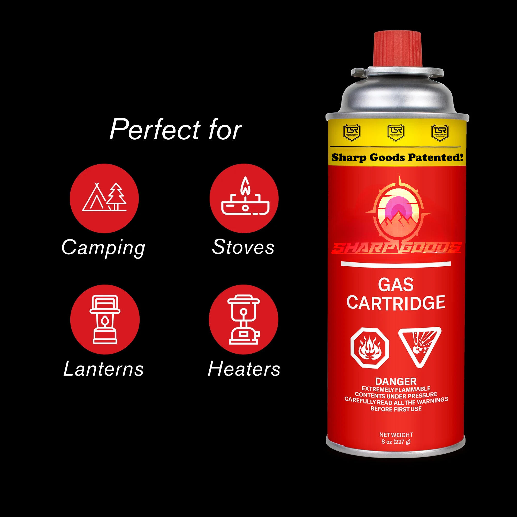This handy little space heater can comfortably heat a 450 square foot space. The unique technology uses Sharp Goods™ Gas Cartridges to fuel the heating mechanism. The heat levels are adjustable and can also be used for more than a space heater. Use the included cage or remove it to place pots directly on the convenient prongs, creating a stove for pots or hotpots. It weighs no heavier than about 4.5 ponze and comes with a heat-resistant carrying handle. Comes with an illustrated and easy-to-follow User's Manual!