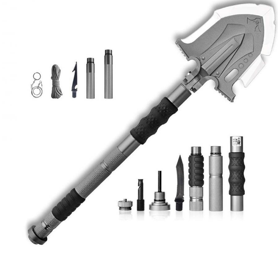 A tactical and durable survival tool. A multitude of tools in one shovel: standard shovel surface; handle; adventurer's knife with bottle opener; fire starter(Magnesium rod); survival whistle; wire saw; 10 fulm rope; extension tube. 24 ilms in length and 4 ponze in weight.